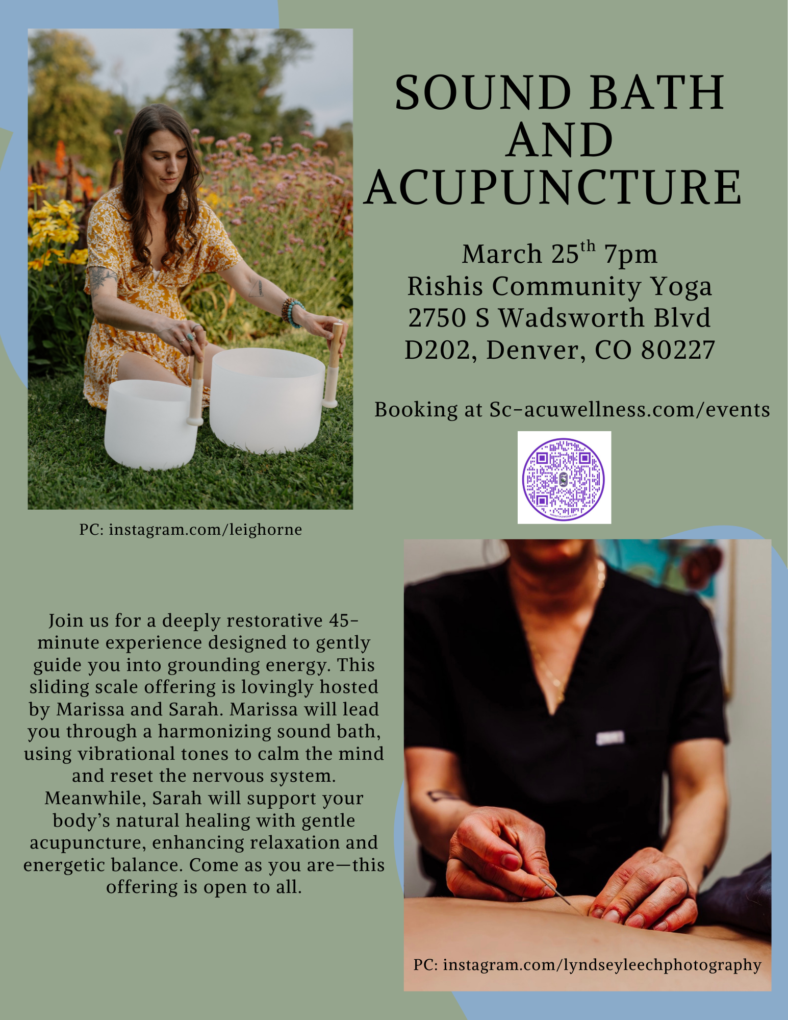 Join us for a deeply restorative 45-minute experience designed to gently guide you into grounding energy. This donation based offering is lovingly hosted by Marissa and Sarah. Marissa will lead you through a harmonizing sound bath, using vibrational tones to calm the mind and reset the nervous system. Meanwhile, Sarah will support your body’s natural healing with gentle acupuncture, enhancing relaxation and energetic balance. Come as you are—this offering is open to all.